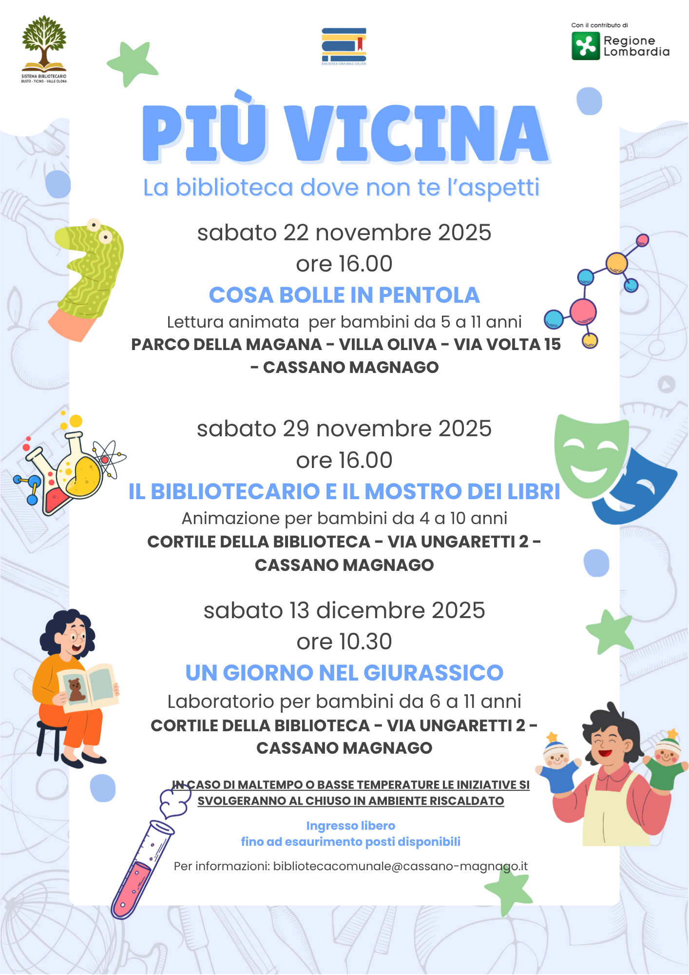 LOCANDINA continua ... LETTURE NATI PER LEGGERE 3-6 ANNI PRESSO ACLI SABATO 15 NOVEMBRE ORE 15.00 2025 - venerdì 7 novembre 2025 LETTURA ANIMATA 5-11 ANNI - 22 NOVEMBRE ORE 16.00- PARCO DELLA MAGANA - venerdì 7 novembre 2025Nell'ambito del progetto del sistema bibliotecario Busto - Ticino - Valle Olona, "Più vicina: la biblioteca dove non te l'aspetti", realizzato con il contributo di Regione Lombardia, proponiamo la lettura animata "Cosa bolle in pentola" per bambini da 5 a 11 anni.
