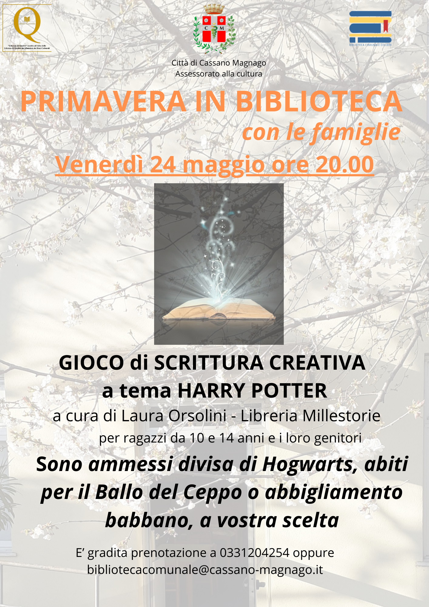 LOCANDINA continua ... CHIUSURA BIBLIOTECA SABATO 2 NOVEMBRE - lunedì 28 ottobre 2024Si ricorda alla gentile utenza che sabato 2 novembre la biblioteca comunale resterà chiusa, come stabilito dal decreto sindacale n.1/2024 del 18 gennaio 2024 continua ... PRIMAVERA IN BIBLIOTECA - EXTRA - giovedì 16 maggio 2024 GIOCO LETTERARIO A TEMA HARRY POTTER - martedì 14 maggio 2024Le atmosfere del mondo magico vi aspettano... sono ammessi la divisa di Hogwarts, gli abiti del Ballo del Ceppo, o abbigliamento babbano... scegliete voi!