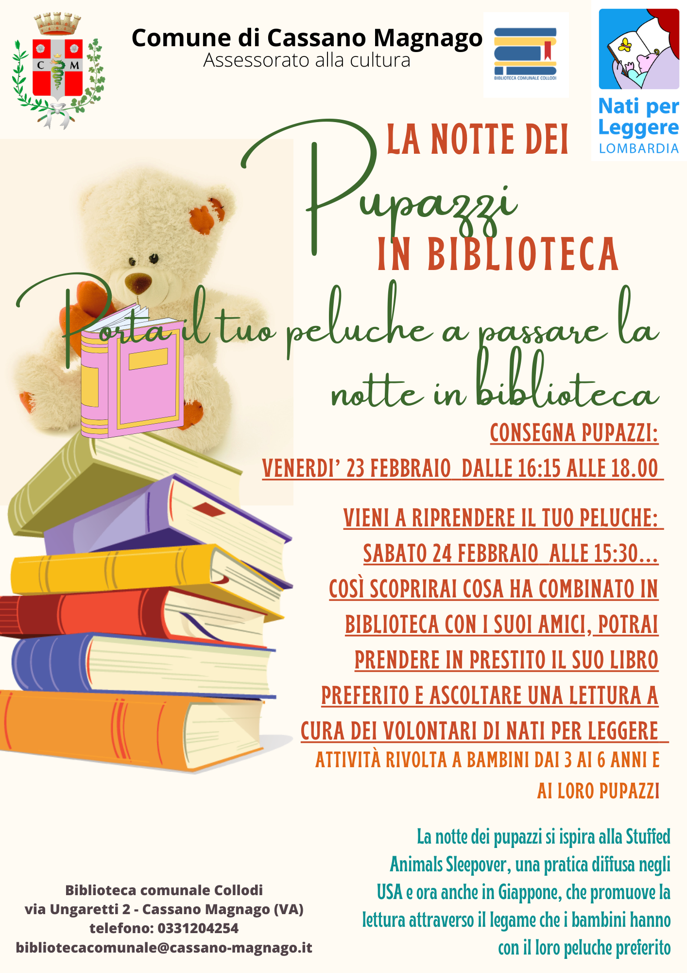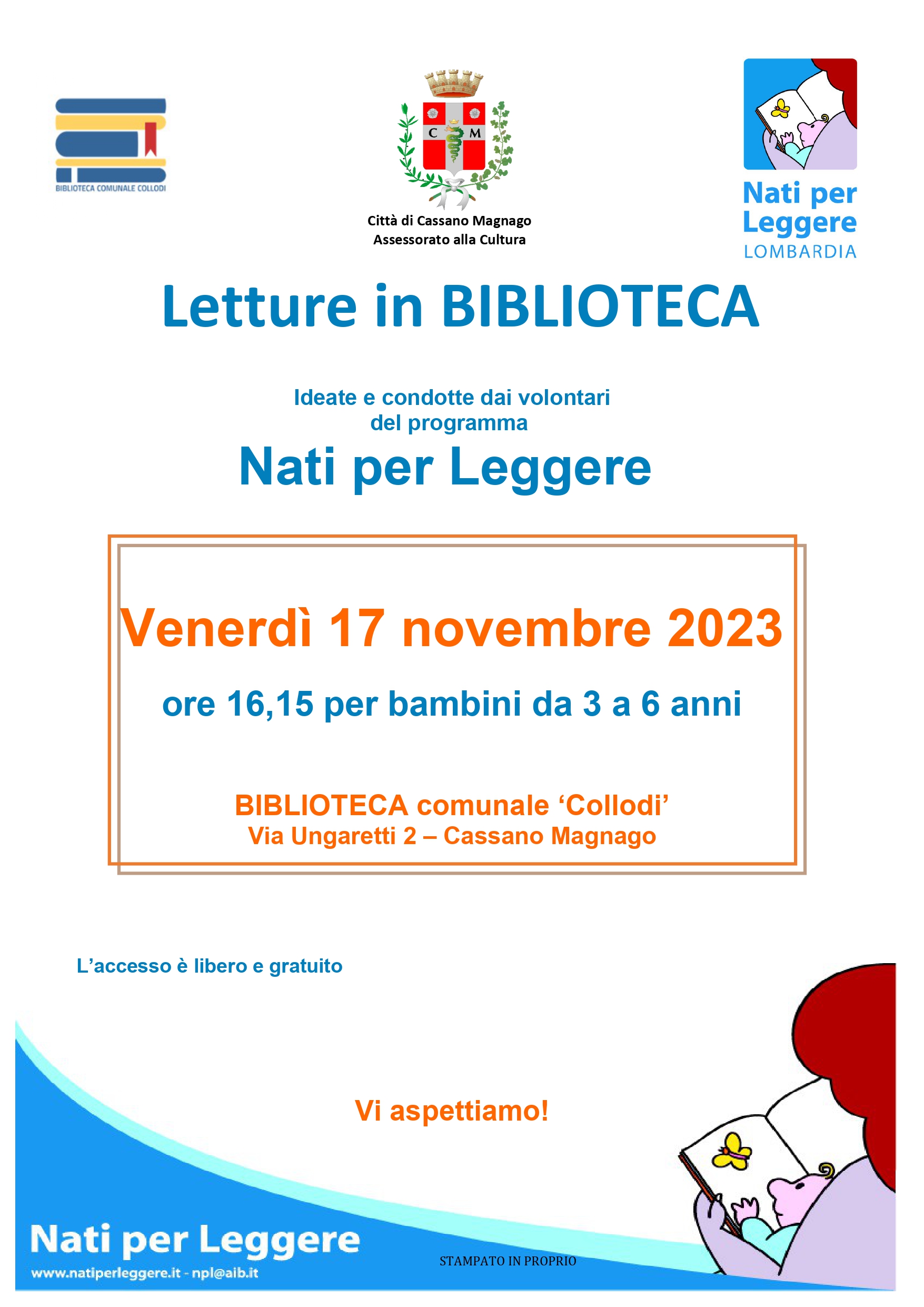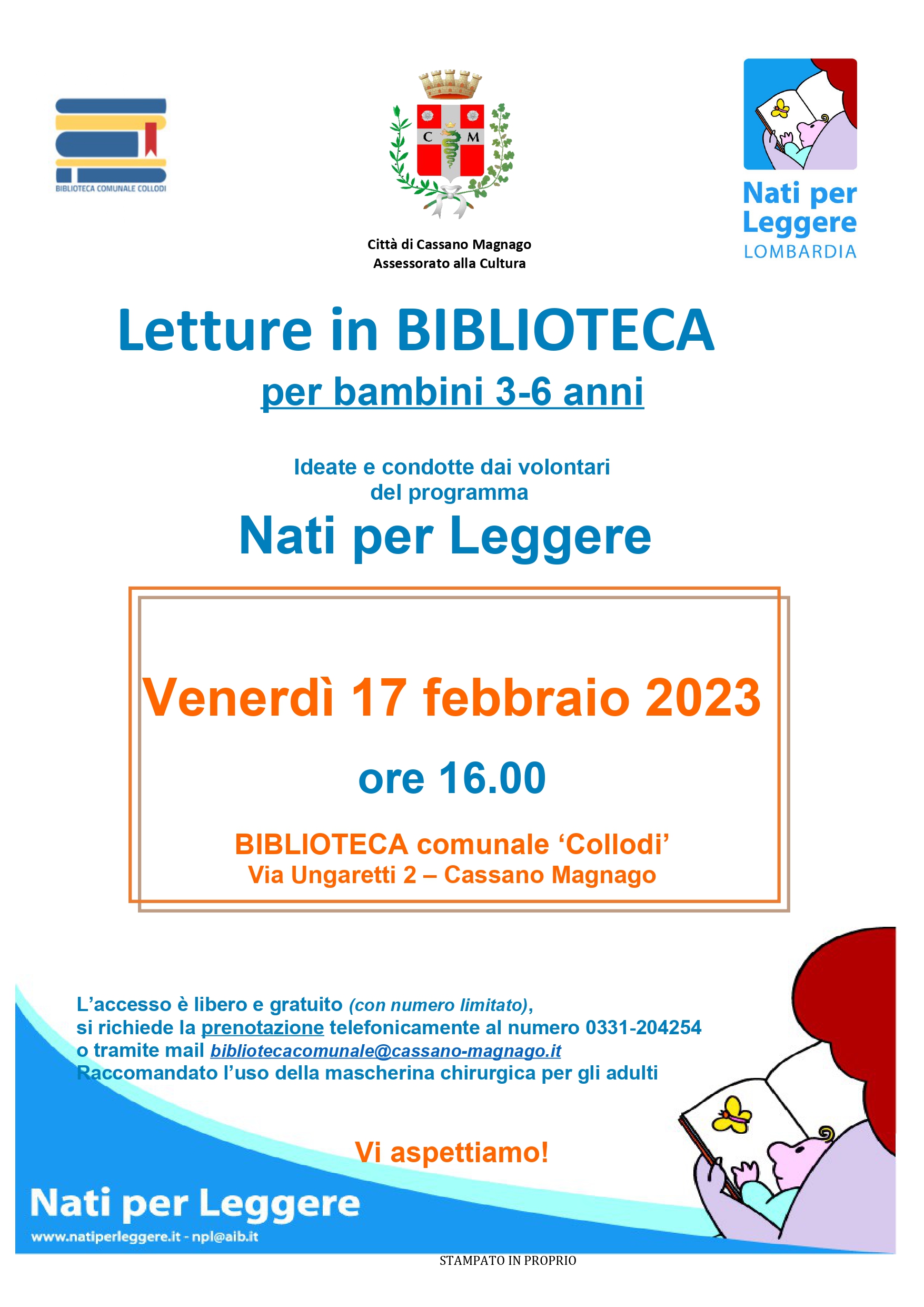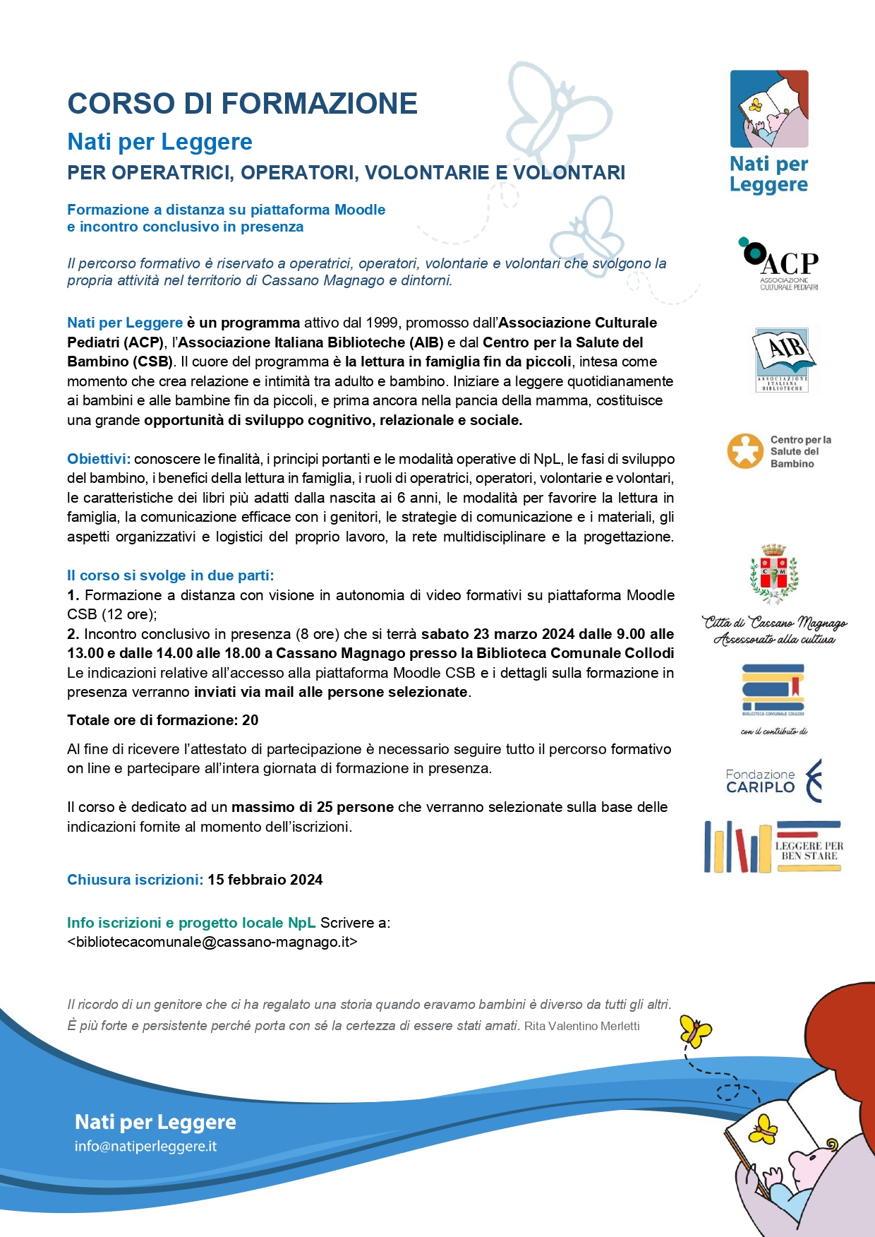 LOCANDINA continua ... CORSO OPERATRICI, OPERATORI, VOLONTARIE E VOLONTARI NATI PER LEGGERE - venerdì 2 febbraio 2024Stiamo raccogliendo iscrizioni per il percorso formativo riservato a operatrici, operatori, volontarie e volontari che svolgono la propria attività nel territorio di Cassano Magnago e dintorni, per promuovere il programma sostenuto da Associazione Culturale Pediatri (ACP), Associazione Italiana Biblioteche (AIB) e Centro per la Salute del Bambino (CSB). Il cuore del programma è la lettura in famiglia fin da piccoli, intesa come momento che crea relazione e intimità tra adulto e bambino. Iniziare a leggere quotidianamente ai bambini e alle bambine fin da piccoli, e prima ancora nella pancia della mamma, costituisce una grande opportunità di sviluppo cognitivo, relazionale e sociale.