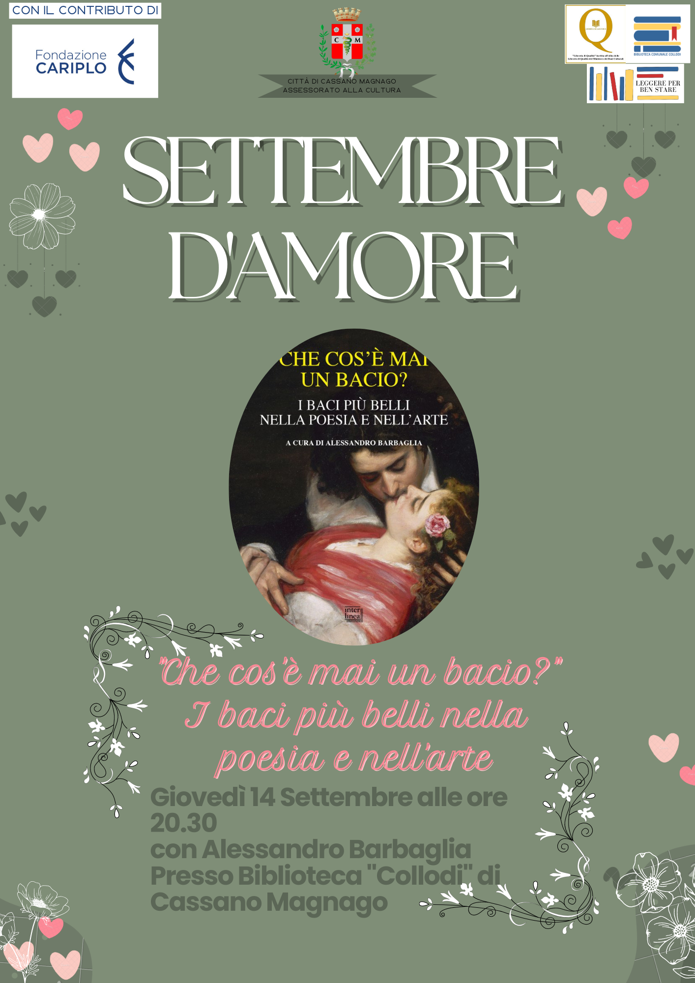 LOCANDINA continua ... SETTEMBRE D'AMORE: INCONTRO CON L'AUTORE ALESSANDR BARBAGLIA - mercoledì 30 agosto 2023Il 14 settembre alle 20.30 vi aspettiamo alla presentazione del volume "Che cos'è mai un bacio? I baci più belli nella poesia e nell'arte". Dalla «bocca mi baciò tutta tremante» di Paolo e Francesca a «ti manderò un bacio con il vento e so che lo sentirai» di Pablo Neruda, con le immagini pittoriche che vanno da Giotto a Chagall, resta sempre aperta la domanda dello stesso Cyrano: «un bacio, insomma, che cos'è un bacio?» dono ideale per esprimere l'indicibile emozione di un atto sempre nuovo, unico.