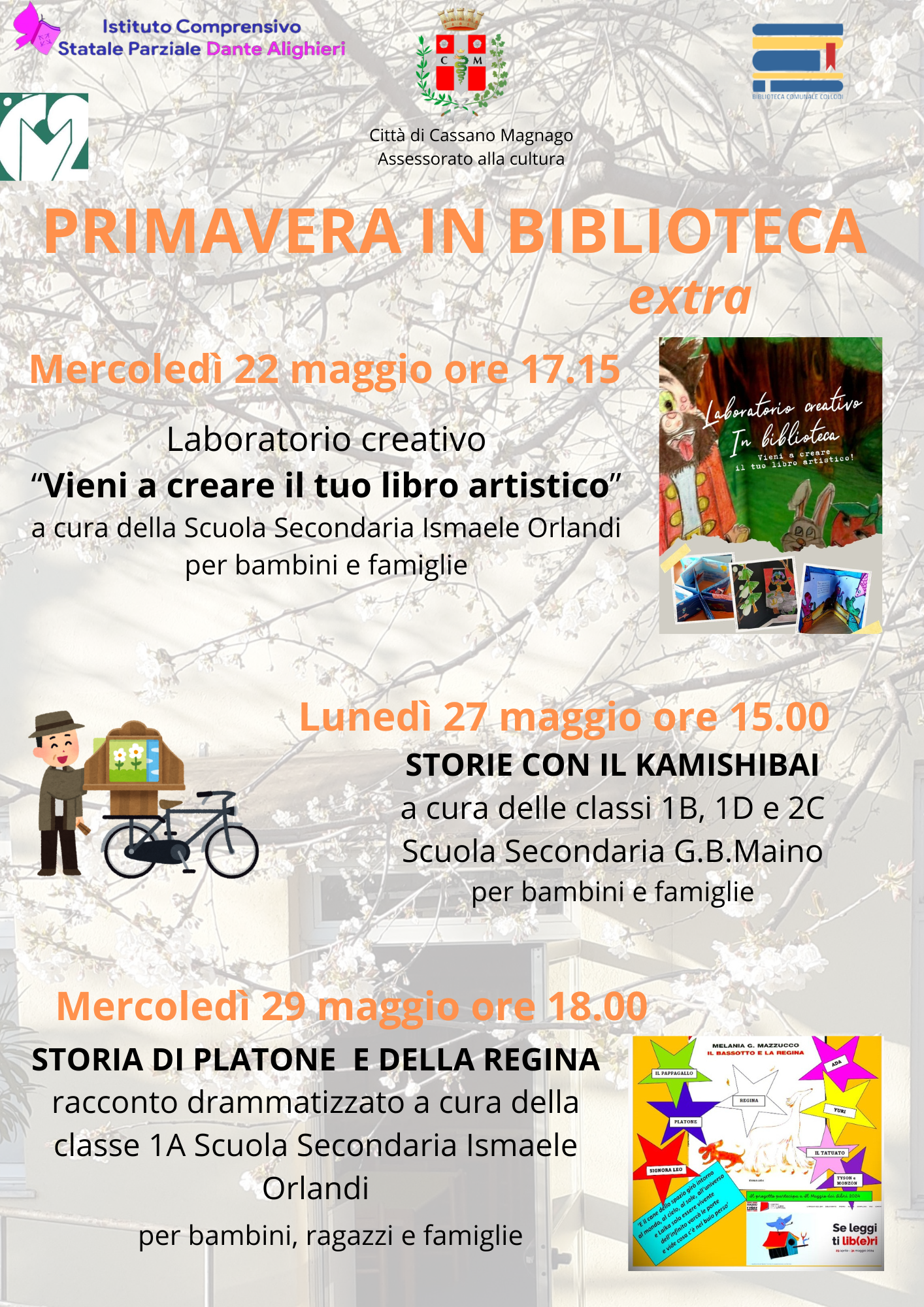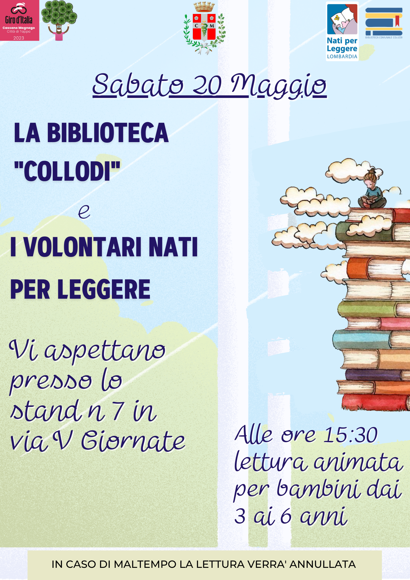 LOCANDINA continua ... LETTURE 3-6 ANNI NATI PER LEGGERE - mercoledì 3 maggio 2023Sabato pomeriggio le letture per bambini dai 3 ai 6 anni vanno in trasferta. Vi aspettiamo presso il circolo Acli alle 16.00. E' necessario iscriversi al numero 0331204254 oppure all'indirizzo bibliotecacomunale@cassano-magnago.it.