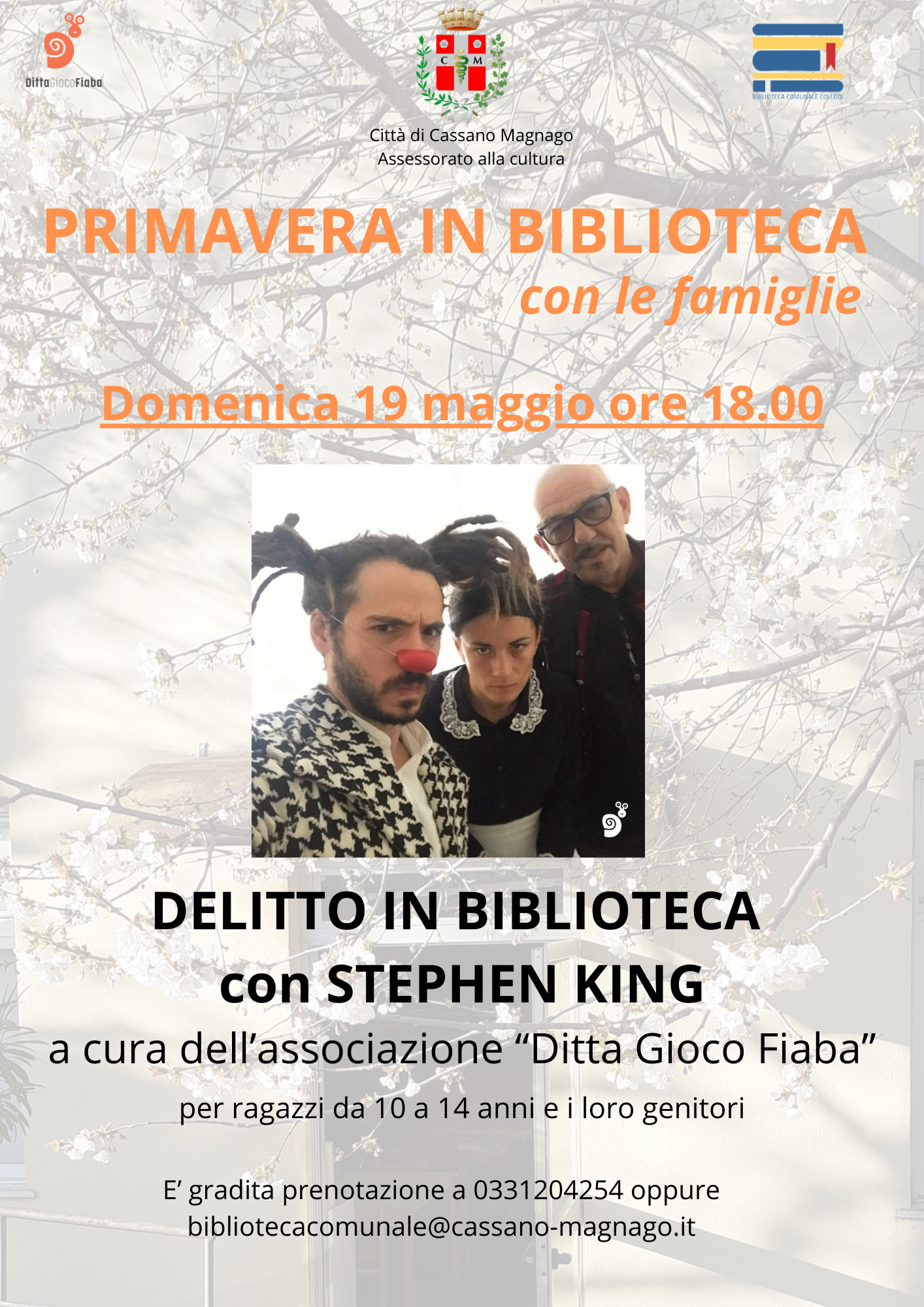 LOCANDINA continua ... DELITTO IN BIBLIOTECA - DOMENICA 19 MAGGIO ORE 18.00 - martedì 14 maggio 2024Aspettiamo i ragazzi dai 10 ai 14 anni e le loro famiglie per un'emozionante indagine letteraria a tema Stephen King!