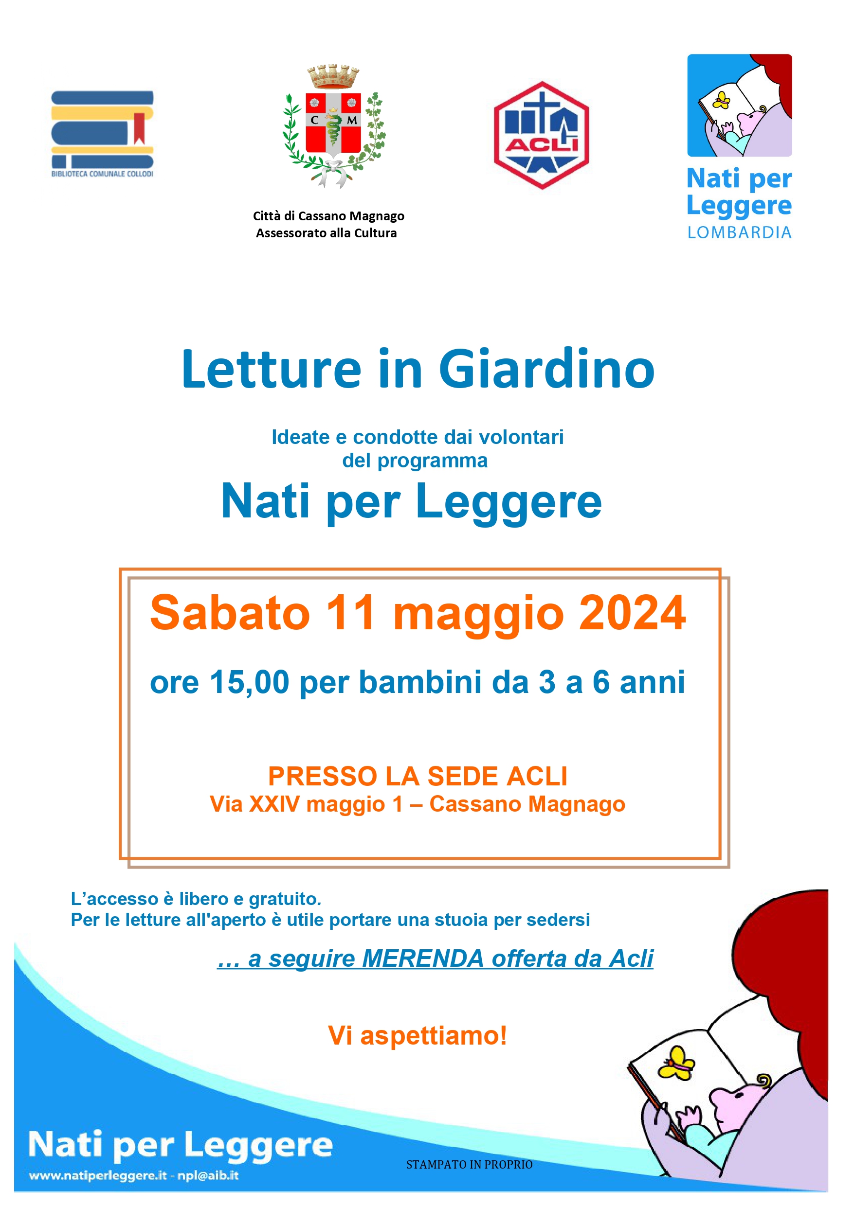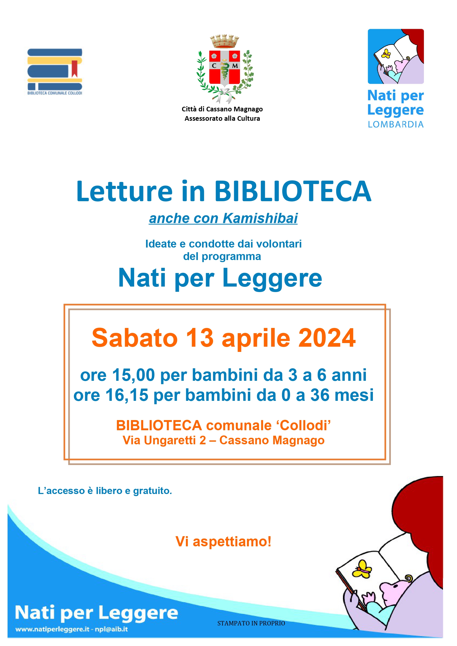 LOCANDINA continua ... LETTURE 3-6 ANNI NATI PER LEGGERE PRESSO CIRCOLO ACLI - giovedì 9 maggio 2024 LETTURE NATI PER LEGGERE SABATO 13 APRILE - lunedì 8 aprile 2024Vi aspettiamo sabato 13, alle 15.00 con i bambini da 3 a 6 anni e alle 16.15 con i piccoli da 0 a 36 mesi!