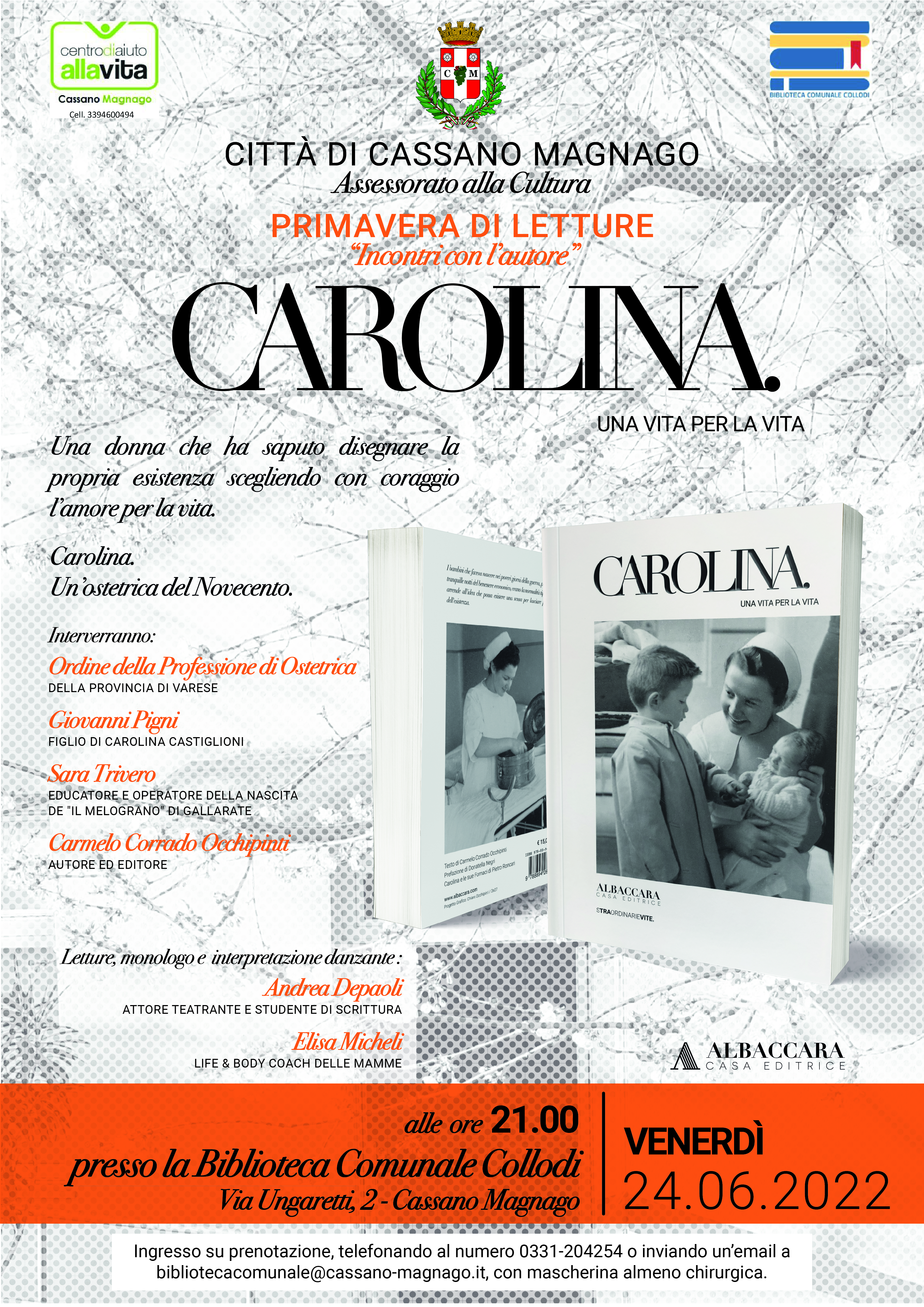LOCANDINA continua ... PRIMAVERA DI LETTURE - PRESENTAZIONE LIBRO "CAROLINA" - VENERDI' 24 GIUGNO ORE 21.00 - venerdì 17 giugno 2022Concludiamo la nostra "Primavera di letture", sconfinando in estate, con la storia vera di un'ostetrica che ha attraversato decenni di storia del Novecento scegliendo sempre con coraggio l'amore per la vita.