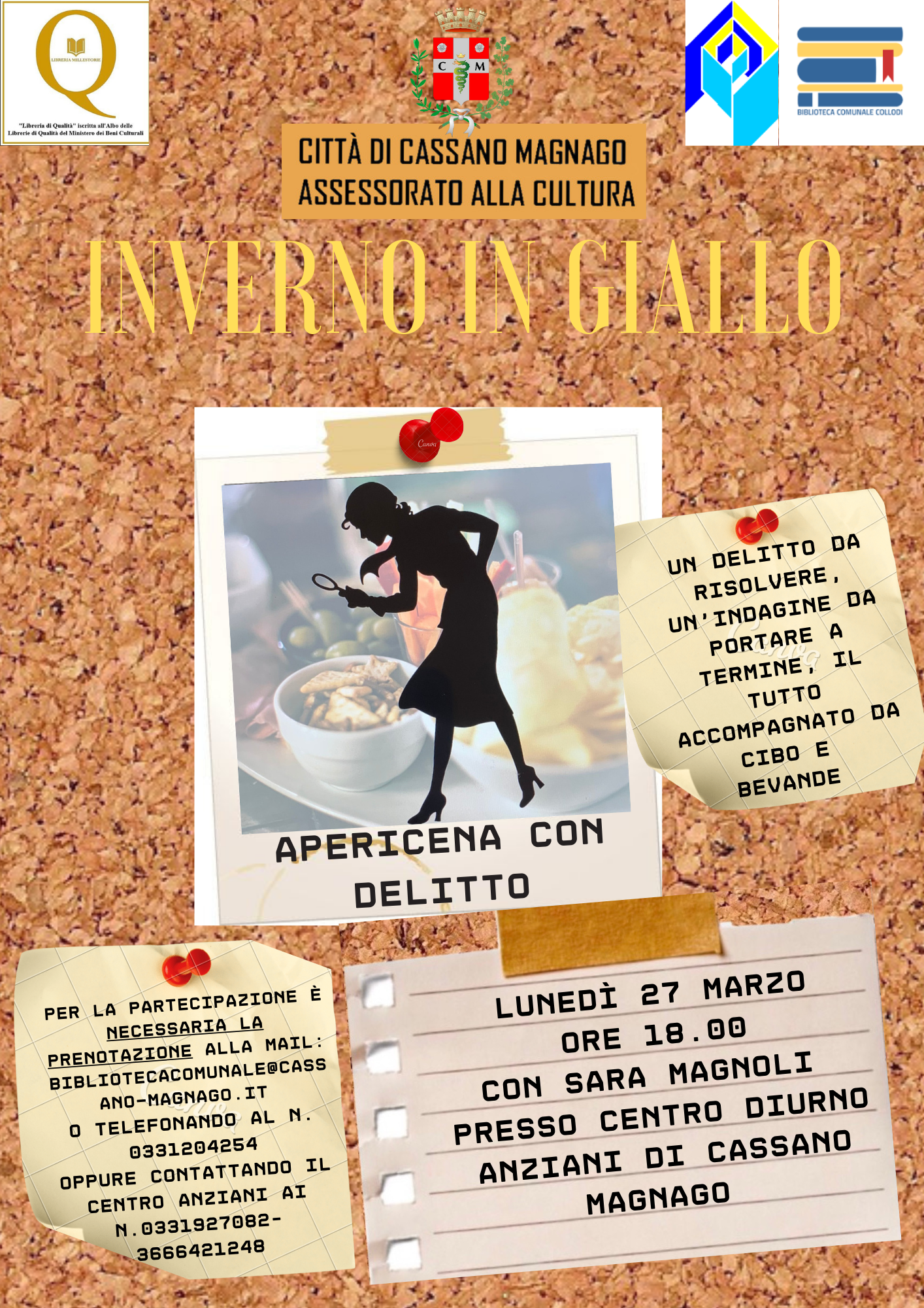 LOCANDINA continua ... APERICENA CON DELITTO 27 MARZO ORE 18.00 - giovedì 2 marzo 2023Lunedì 27 marzo alle 18.00, presso il Centro Diurno Anziani, che ringraziamo per l'ospitalità e la collaborazione, apericena con delitto a cura di Sara Magnoli.