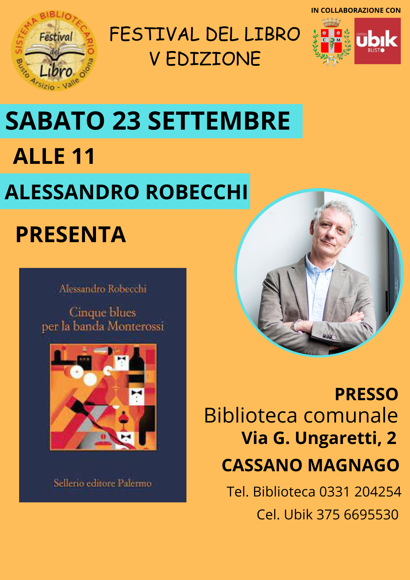 LOCANDINA continua ... INCONTRO CON L'AUTORE ALESSANDRO ROBECCHI - martedì 29 agosto 2023Sabato 23 settembre alle 11.00, in occasione del Festival del Libro del Sistema Bibliotecario Busto Arsizio Valle Olona, ospiteremo l'incontro con l'autore Alessandro Robecchi, che presenterà il suo ultimo libro "Cinque Blues per la banda Monterossi", edito da Sellerio.
