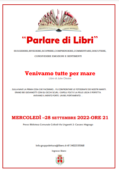 LOCANDINA continua ... INCONTRO DEL GRUPPO DI LETTURA "COLLODI" MERCOLEDI' 28 SETTEMBRE - venerdì 16 settembre 2022Il 28 settembre il gruppo di lettura propone "Venivamo tutte per mare", della scrittrice americana Julie Otsuka.