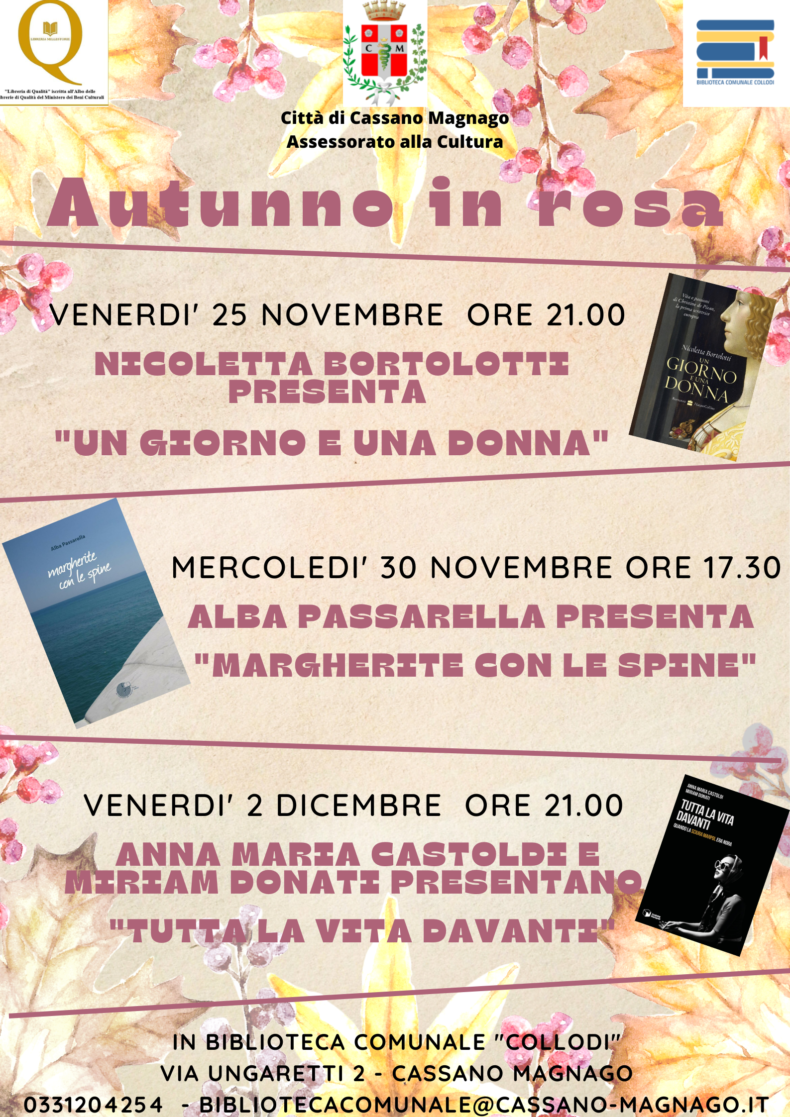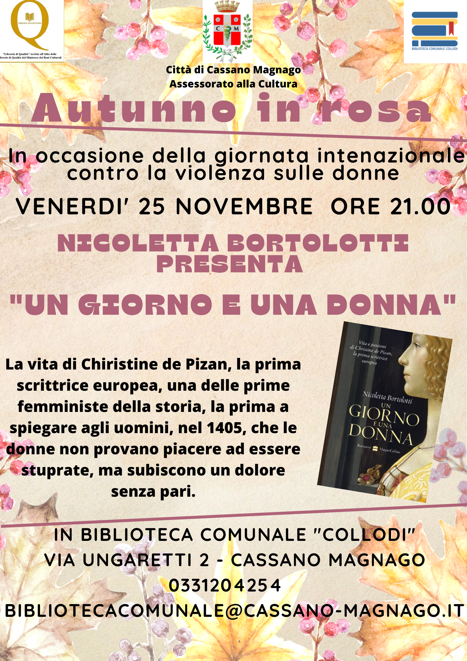 LOCANDINA continua ... AUTUNNO IN ROSA - INCONTRO CON L'AUTRICE ALBA PASSARELLA - martedì 29 novembre 2022 AUTUNNO IN ROSA - INCONTRO CON LE AUTRICI DONATI E CASTOLDI - martedì 29 novembre 2022 AUTUNNO IN ROSA - PRESENTAZIONE ROMANZO "UN GIORNO E UNA DONNA" - lunedì 21 novembre 2022In occasione della giornata internazionale per l'eliminazione della violenza contro le donne, l'autrice Nicoletta Bortolotti presenta la biografia di una delle prime donne ad aver lottato, nel 1405, per l'emancipazione e l'uguaglianza femminile. Vi aspettiamo!