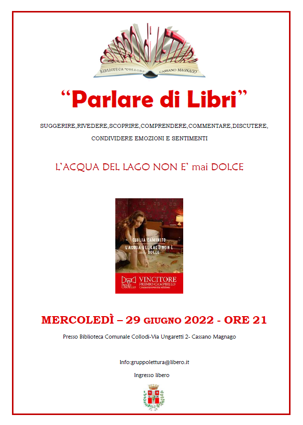 LOCANDINA continua ... ANNULLAMENTO INCONTRO CON L'AUTRICE MERCOLEDI' 8 GIUGNO - martedì 7 giugno 2022Si comunica che l'incontro con Valeria Montaldi è annullato precauzionalmente a tutela della salute dell'autrice. Speriamo di poterlo recuperare in autunno. continua ... INCONTRO DEL GRUPPO DI LETTURA MERCOLEDI' 29 GIUGNO - giovedì 26 maggio 2022Per l'ultimo incontro prima della pausa estiva il gruppo di lettura ha scelto il volume vincitore del Premio Campiello 2021, "L'acqua del lago non è mai dolce".