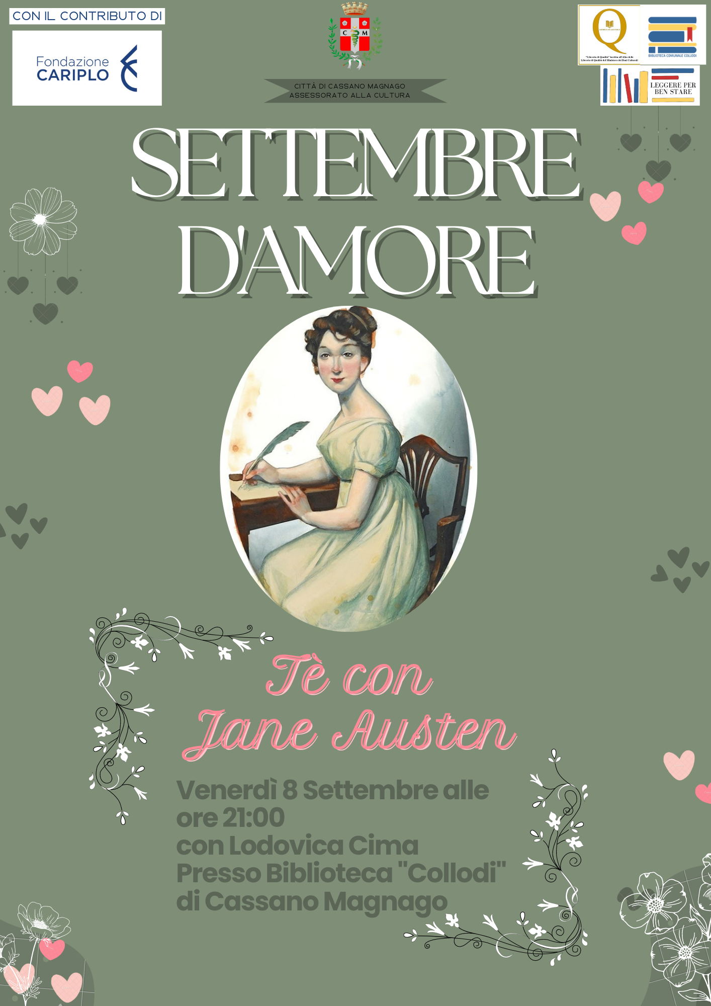 LOCANDINA continua ... SETTEMBRE D'AMORE : UN TE' CON JANE AUSTEN - mercoledì 30 agosto 2023L'8 settembre alle 21.00 una serata, con Lodovica Cima, per conoscere la famosa autrice inglese, la prima a mettere le donne al centro dei suoi romanzi, dipingendo tutta l'umanità delle sue eroine, ricche di pregi ma anche di difetti.