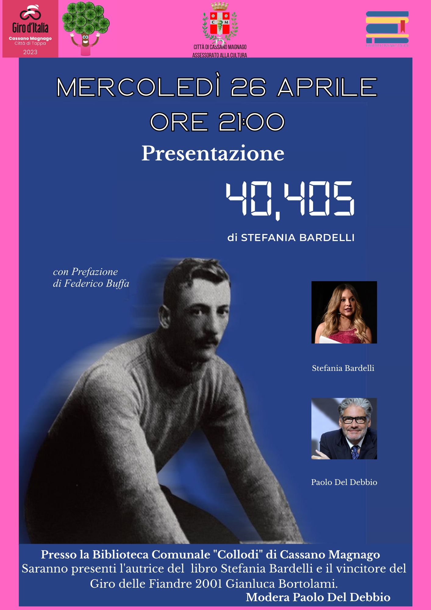 LOCANDINA continua ... PRESENTAZIONE DEL LIBRO 40,405 - venerdì 21 aprile 2023Mercoledì 26 Aprile 2023, alle ore 21, presenteremo il libro "40,405" di Stefania Bardelli, dedicato al vincitore del primo Giro d'Italia, Luigi Ganna.