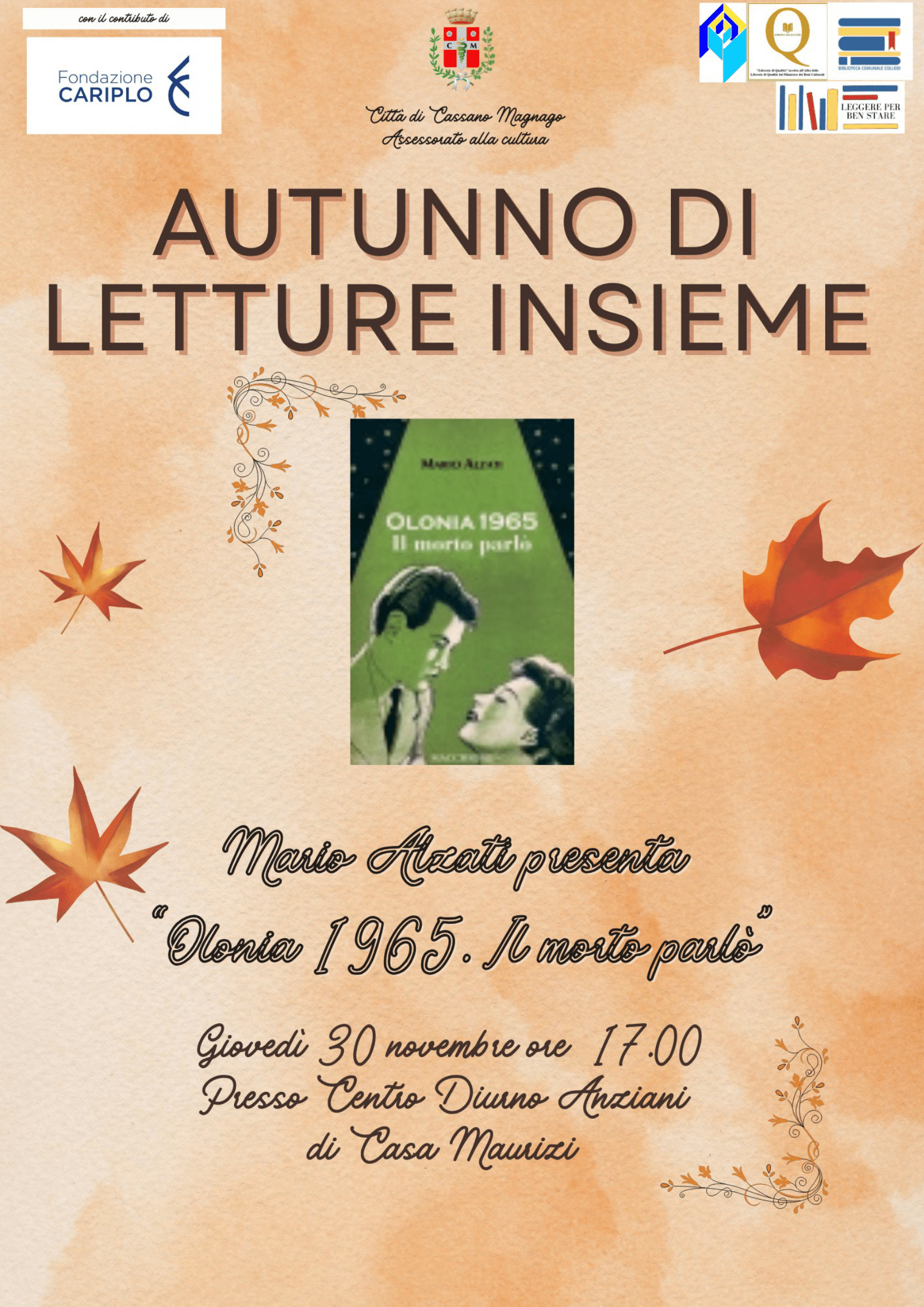 LOCANDINA continua ... INCONTRO CON L'AUTORE - PRESENTAZIONE LIBRO PRESSO CENTRO ANZIANI - venerdì 3 novembre 2023Giovedì 30 novembre alle 17.00 presso il Centro Anziani di via Cavalier Colombo, presentazione aperta a tutti dell'ultimo libro di Mario Alzati "Olonia 1965. Il morto parlò"