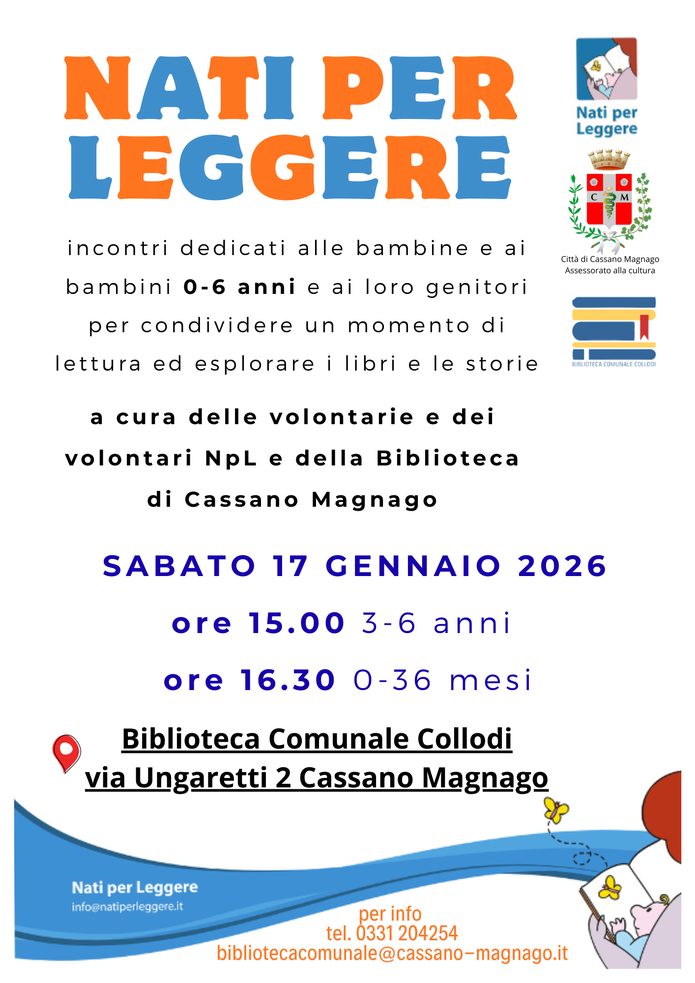 LOCANDINA continua ... LETTURE NATI PER LEGGERE SABATO 17 GENNAIO - giovedì 8 gennaio 2026Sabato 17 gennaio primo incontro dell'anno con le volontarie e i volontari di Nati per Leggere Lombardia, alle 15.00 per i bambine e bambini dai 3 ai 6 anni e alle 16.30 per i piccoli da 0 a 36 mesi.
