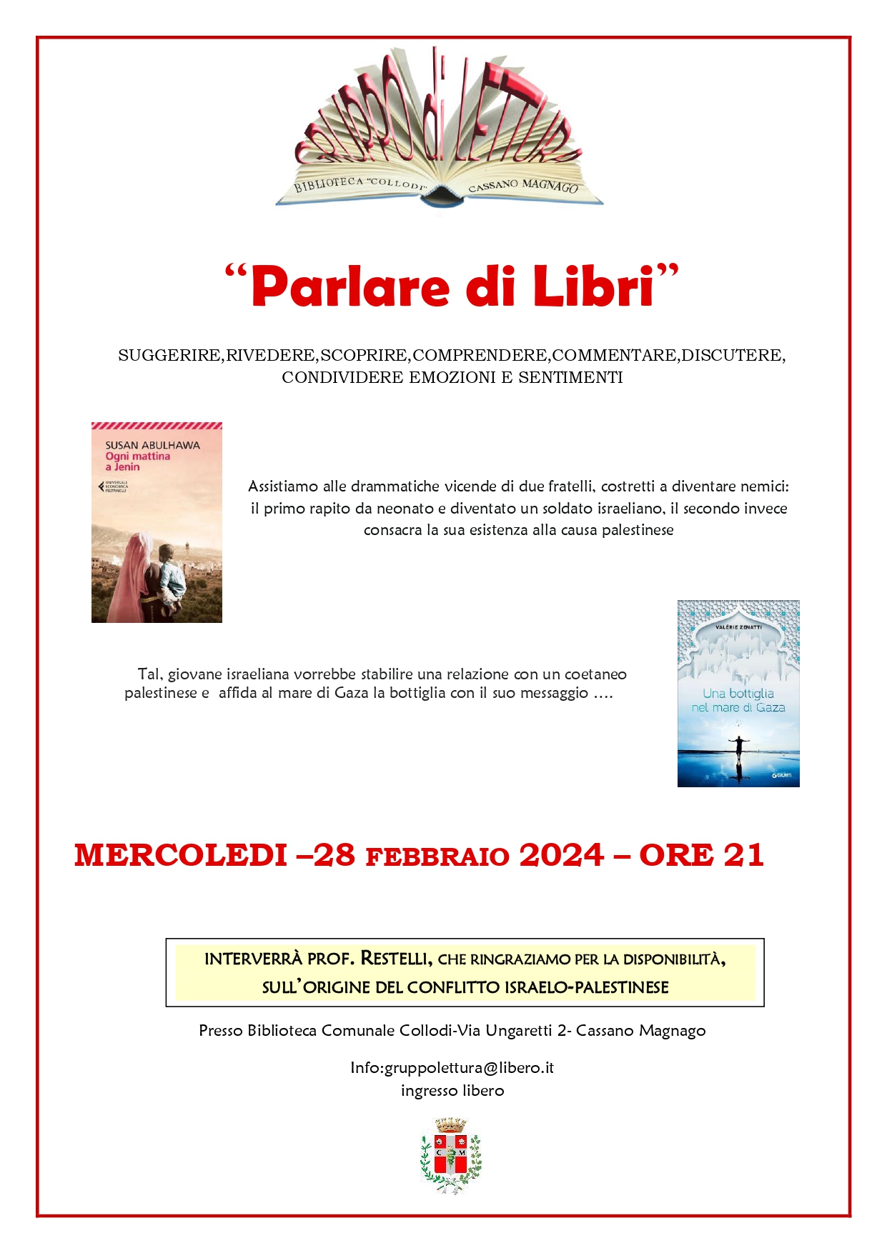 LOCANDINA continua ... INCONTRO GRUPPO DI LETTURA 28 FEBBRAIO - giovedì 1 febbraio 2024Mercoledì 28 febbraio il gruppo di lettura discuterà di libri ma anche di attualità, grazie alla presenza del professor Restelli, docente di storia, che cercherà di spiegare le radici del conflitto israelo-palestinese.