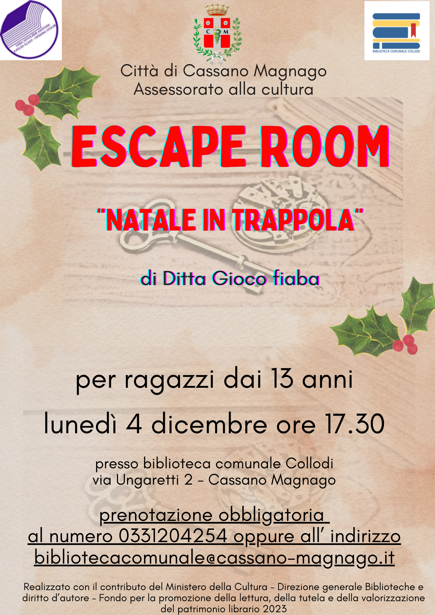continua ... LETTURE DI NATALE NATI PER LEGGERE 3-6 ANNI E 0-36 MESI - giovedì 14 dicembre 2023 ESCAPE ROOM - NATALE IN TRAPPOLA! - giovedì 30 novembre 2023Aspettiamo i ragazzi dai 13 anni per un'avventura natalizia in biblioteca!
