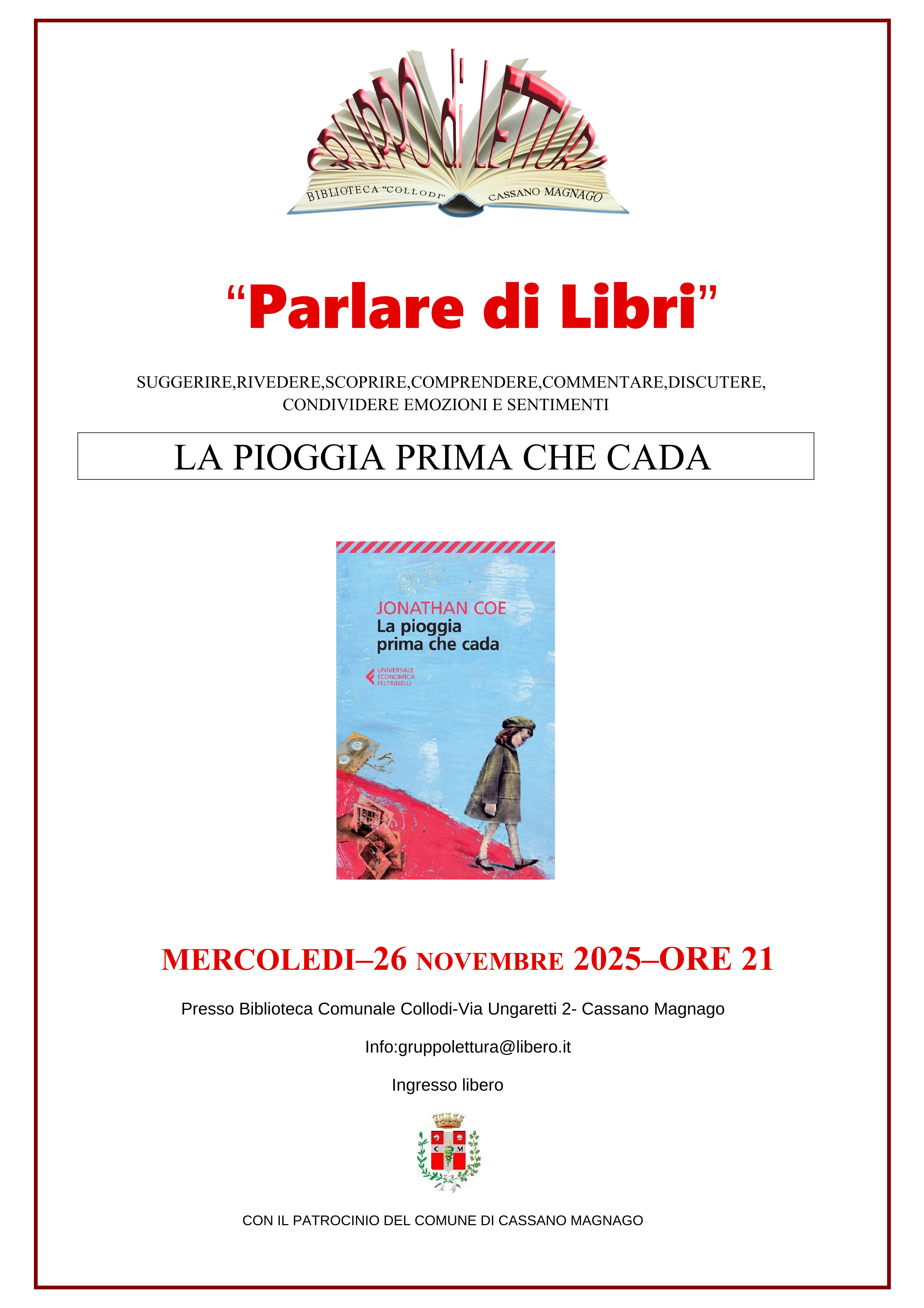 LOCANDINA continua ... GRUPPO DI LETTURA COLLODI - 26 NOVEMBRE ORE 21.00 - venerdì 7 novembre 2025Il gruppo di lettura, come ogni ultimo mercoledì del mese, si ritrova per commentare "La pioggia prima che cada". Ingresso libero e gratuito anche per chi non avesse avuto ancora modo di leggere il libro.