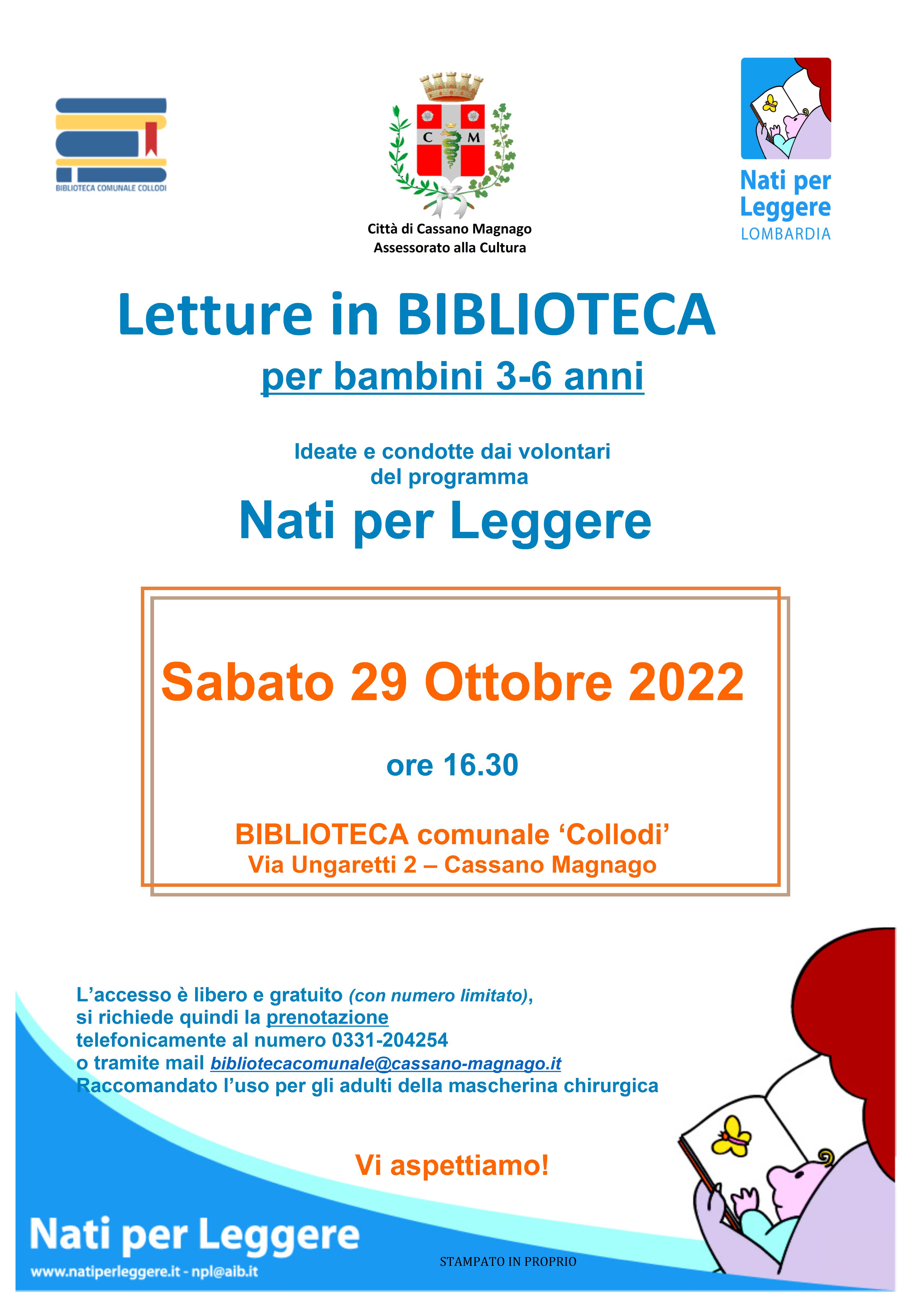 LOCANDINA continua ... LETTURE IN BIBLIOTECA NATI PER LEGGERE 3-6 ANNI - venerdì 14 ottobre 2022Il 29 ottobre i volontari del programma Nati per Leggere propongono un pomeriggio particolare per i bambini dai 3 ai 6 anni.