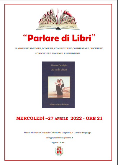 ALLEGATO continua ... INCONTRO DEL GRUPPO DI LETTURA MERCOLEDI' 27 APRILE ORE 21.00 - venerdì 1 aprile 2022Il prossimo incontro del gruppo di lettura ci porta nel giallo, con uno dei più apprezzati autori italiani degli ultimi anni. Vi aspettiamo, come di consueto numerosi!